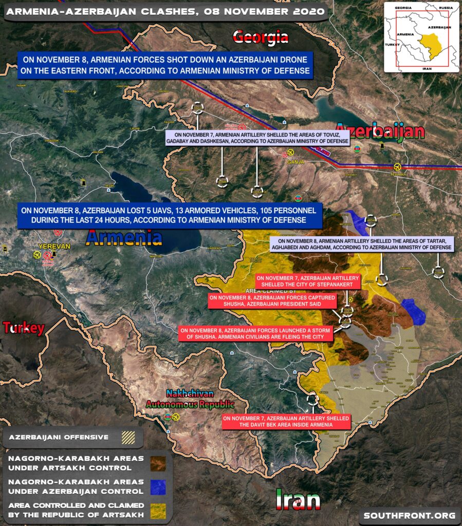 আজারবাইজানের সৈন্যরা আর্মেনিয়া দখলিকৃত নগর্নো-কারাবাখ অঞ্চলের রাজধানী স্টেপানাকার্ট (খানকেন্দি) এর নিকট সামরিক দিক থেকে গুরুত্বপূর্ণ শহর শুশা দখল করে নিয়েছে। আর্মেনিয়িার সাথে যোগাযোগ রক্ষাকারী সড়কের লাচিন করিডোরের উপর কৌশলগত এই শুশা শহরটি দখলে নেয়ার ফলে রাজধানী স্টেপানাকার্ট একপ্রকার অবরুদ্ধ হয়ে পড়বে। রাজধানী স্টেপানাকার্ট থেকে মাত্র ৬ মাইল দক্ষিণে এবং আর্মেনীয়ার সাথে সংযোগকারী রাস্তায় লাচিন করিডোরে এই শুশা শহরটির দখলে নেয়া সামরিক দিক থেকে গুরুত্বপূর্ণ বলছেন বিশেষজ্ঞরা। শুশা হাতছাড়া মানেই হল আর্মেনিয়া এ যুদ্ধে কৌশলগত পরাজয় হল। এর ফলে আজারবাইজানের পক্ষে রাজধানী দখল এখন সময়ের ব্যাপার মাত্র। আজারবাইজানের প্রেসিডেন্ট ইলহাম আলিয়েভ শুশা দখলকে যুদ্ধে এক ঐতিহাসিক বিজয় বলেছেন।